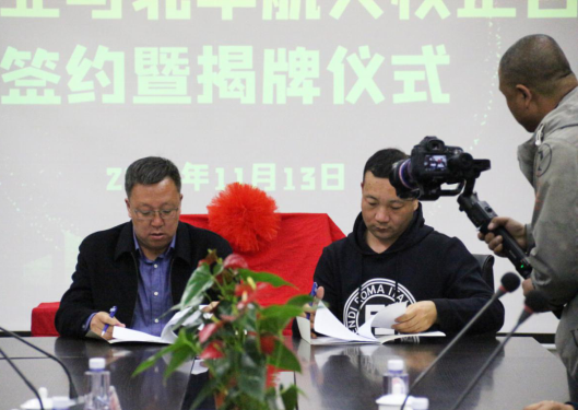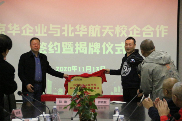 揭牌儀式上,北華航天工業(yè)學(xué)院校長陳剛、京華企業(yè)總經(jīng)理陳鐵柱一起為此次校企合作揭牌。