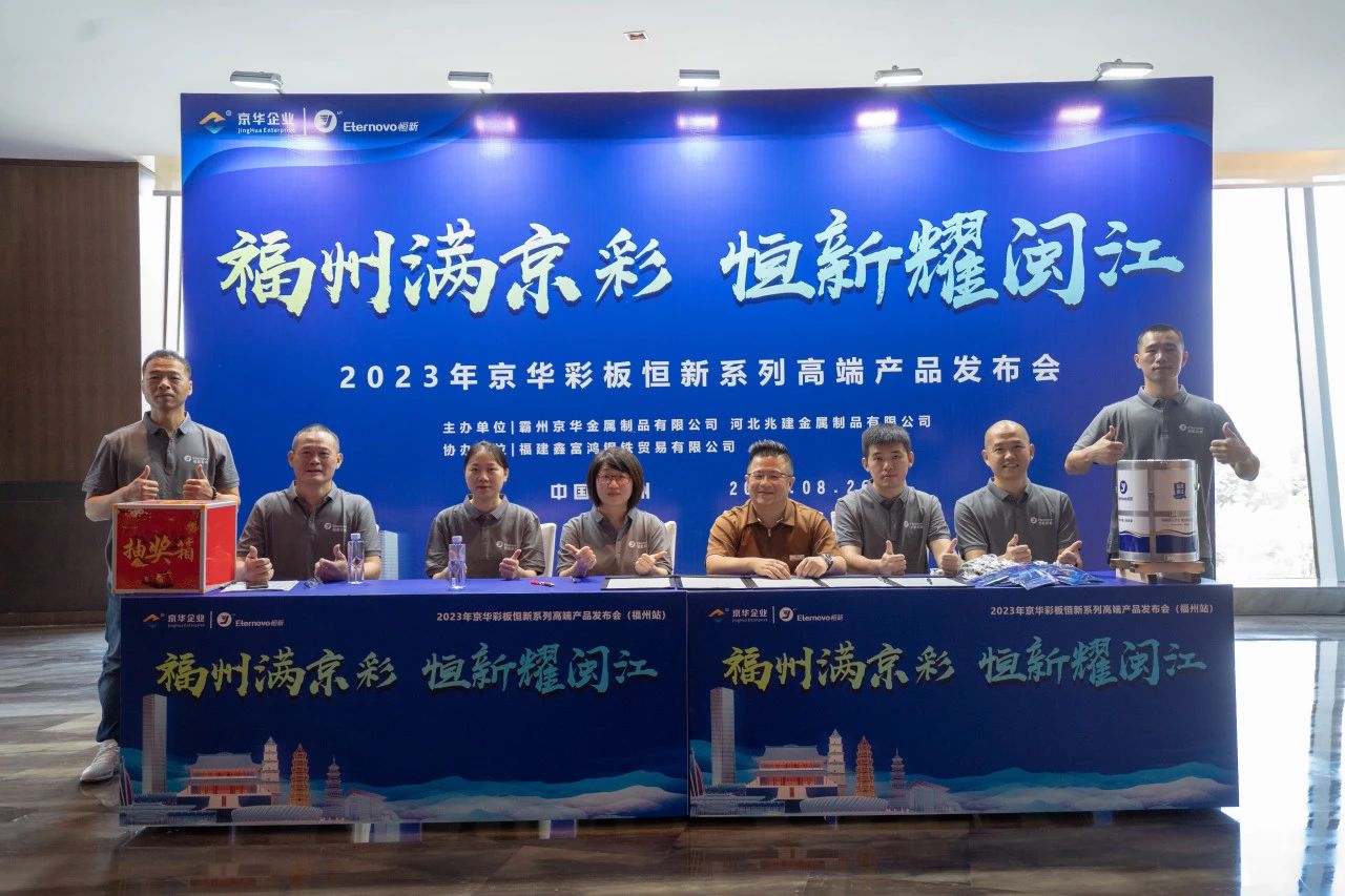 福州滿京彩,恒新耀閩江。2023年8月26日,京華企業(yè)恒新系列彩涂板推介會(福州站)在三迪希爾頓酒店圓滿召開。此次會議主要展現(xiàn)了京華企業(yè)優(yōu)秀的企業(yè)文化和恒新系列彩涂板的顯著優(yōu)勢,恒新系列彩涂板將引領(lǐng)彩涂行業(yè)走高品質(zhì)定制化路線。京華企業(yè)攜手全國金屬涂鍍行業(yè)合作伙伴合作共贏,共創(chuàng)輝煌。