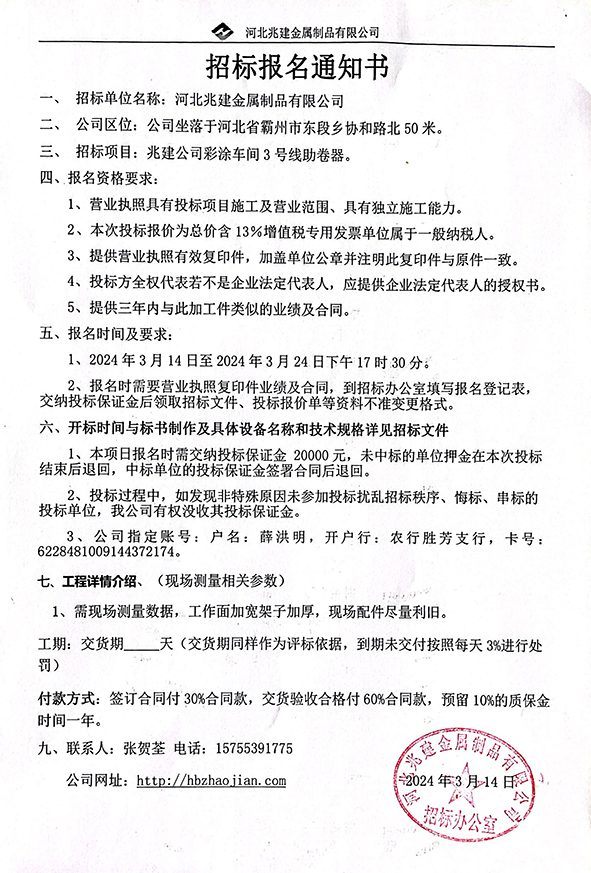 - 招標(biāo)業(yè)主: 河北兆建金屬制品有限公司